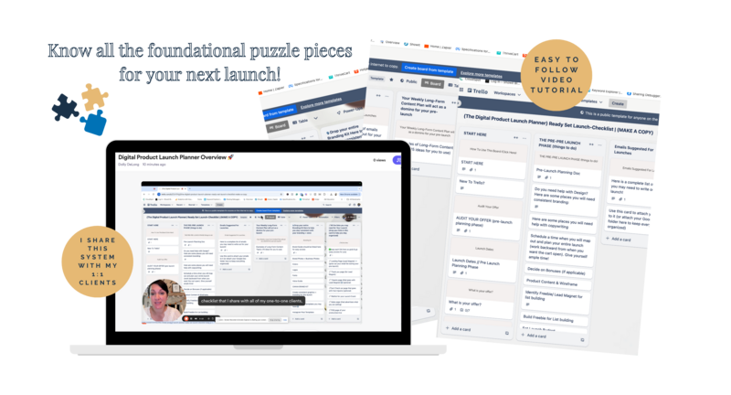 A plug-and-play Trello board that walks you step-by-step through my exact launch system — the same one I use for my own digital products and client launches — so you can plan, organize, and execute your next launch with confidence.